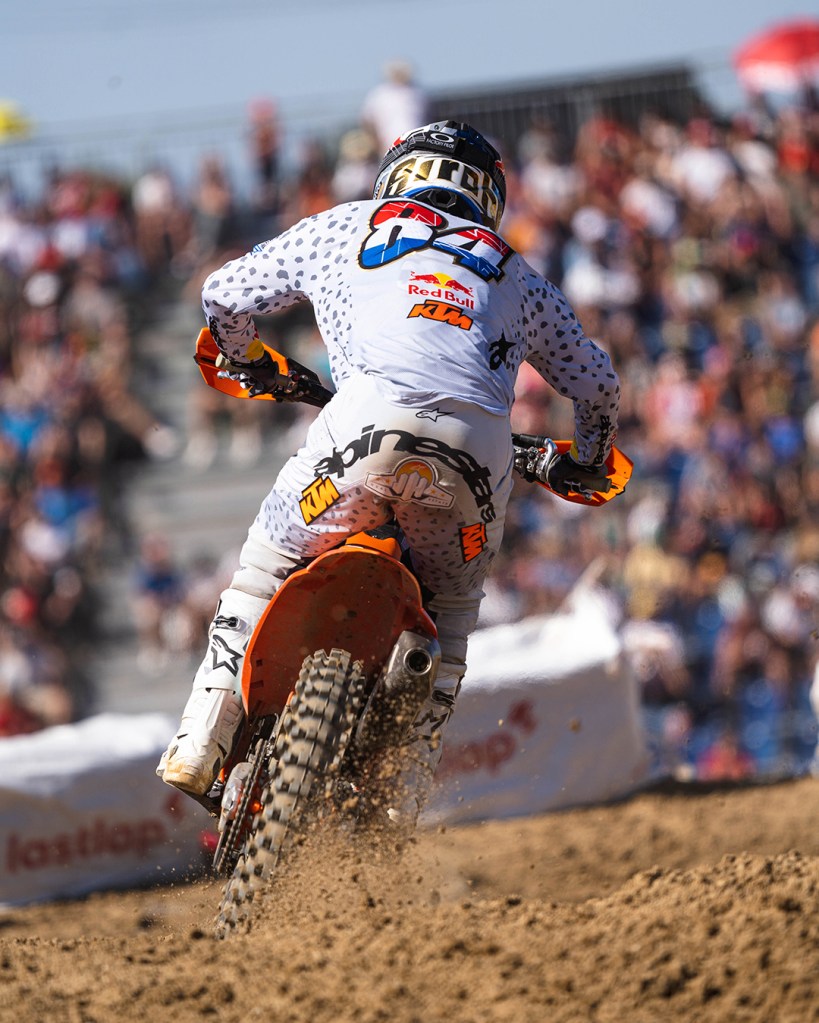 Faltando 12 minutos para el final de la carrera, Herlings lanzó un ataque decidido, mostrando una vez más su velocidad sobresaliente. Después de una intensa batalla en las vueltas siguientes, el piloto neerlandés logró superar a Mattia Guadagnini y se posicionó en el segundo lugar. Y en menos de una vuelta, el número 84 también dejó atrás a Rubén Fernández para tomar la delantera y asegurar la victoria en ambas mangas.